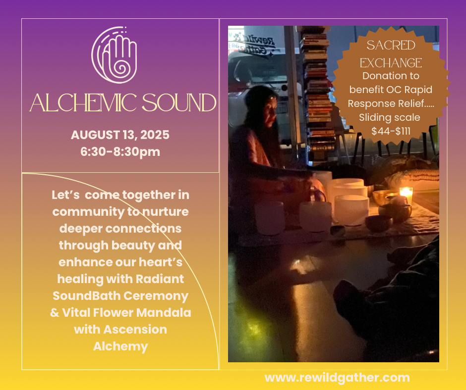 Alchemic Sound Bath & Flower Mandala Meditation Wednesday, August 13, 2025 6:30 PM Thursday, August 14, 2025 8:30 PM Rewild & Gather 1550 South Harbor Boulevard La Habra, CA, 90631 United States (map) Google Calendar ICS